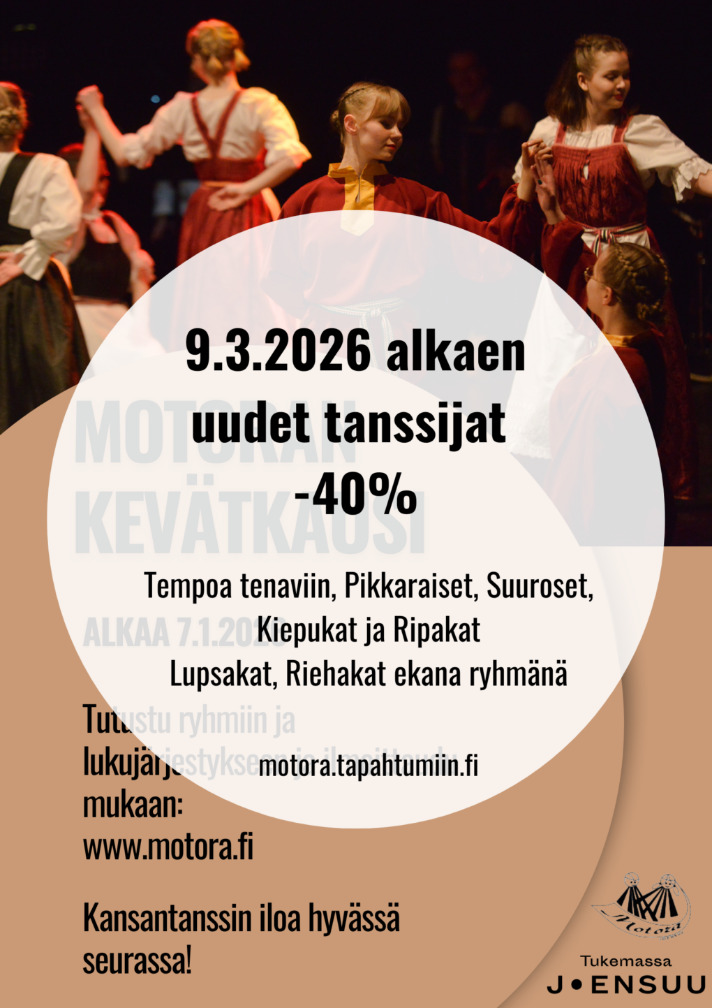 Uudet tanssijat pääsevät loppukevääksi (9.3.2026 alkaen) mukaan -40 % alennuksella niihin ryhmiin, joissa tilaa on eli Tempoa Tenaviin, Pikkaraiset, Suuroset, Kiepukat, Ripakat sekä Lupsakat ja Riehakat ensimmäisenä ryhmänä.