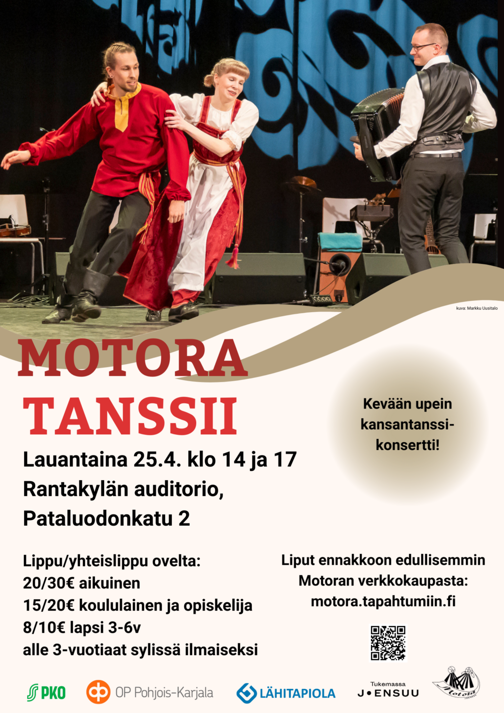 Kevätkautemme huipentuu lauantaina 25.4.2026 järjestettävään Motora tanssii -kevätkonserttiin, jonka näytökset pidetään klo 14 ja klo 17. Konsertti pidetään Rantakylän auditoriossa (Pataluodonkatu 2, Joensuu).