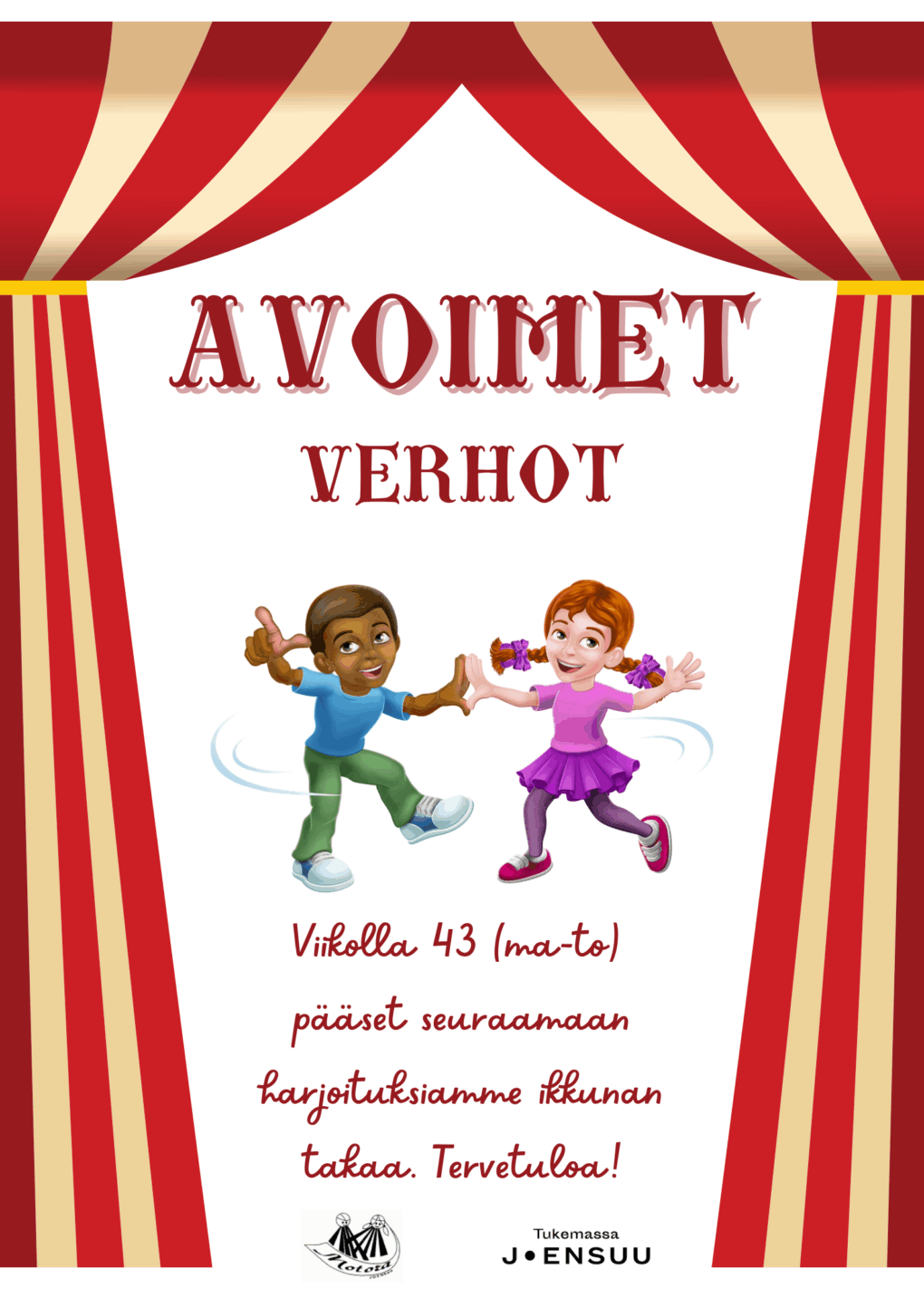 Avoimet verhot viikolla 43 Viikolla 43 eli 20.–23.10.2025 pääsee tanssiharjoituksiamme katsomaan myös ikkunan takaa Papinkadulta, sillä tuolloin harjoittelemme avoimin verhoin. Tervetuloa seuraamaan!